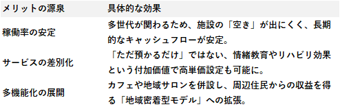 これまでの福祉ビジネスは、ターゲットを「高齢者のみ」あるいは「子供のみ」に絞るのが一般的でした。しかし、これらを統合することで、以下のような経営的相乗効果(シナジー)が生まれます。