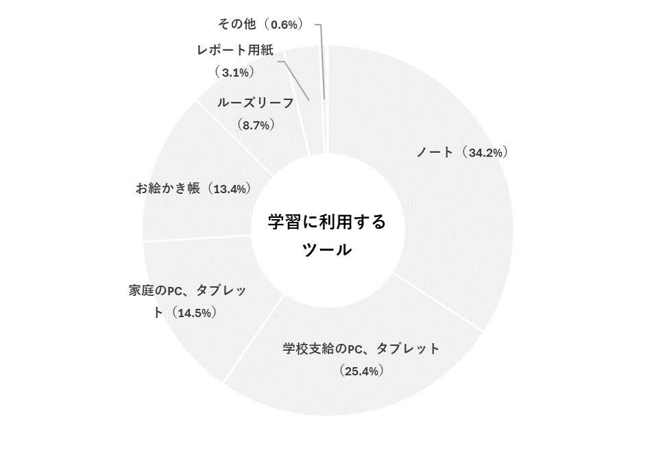 教育支援活動を行う株式会社スフレが行った調査によると、子どもが学習時にどのツールを使うかという質問に対して、3割強が紙のノートを利用していることがわかりました。コロナ禍でPCやタブレットの利用が大幅に増えた印象がありますが、それでもなお、紙のノートにはポテンシャルがあります。