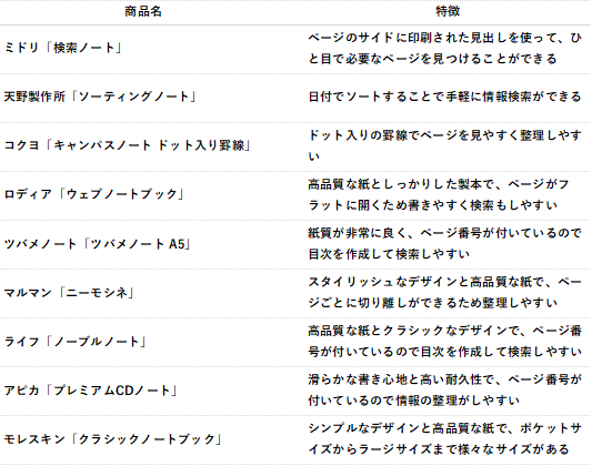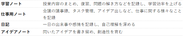 紙のノートに対する主なニーズは4つありますが、いずれも既存の商品(競合)によってカバーされていることは自明です。他にニーズが埋もれていないか、ノートの種類と役割を確認してみましょう。