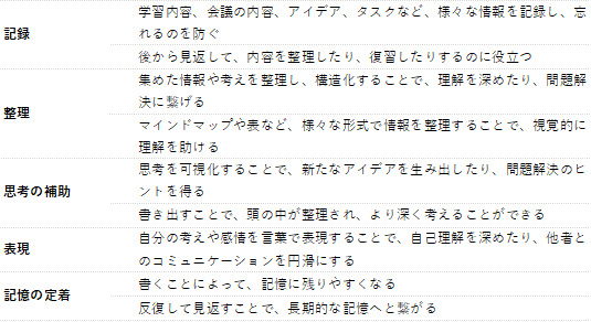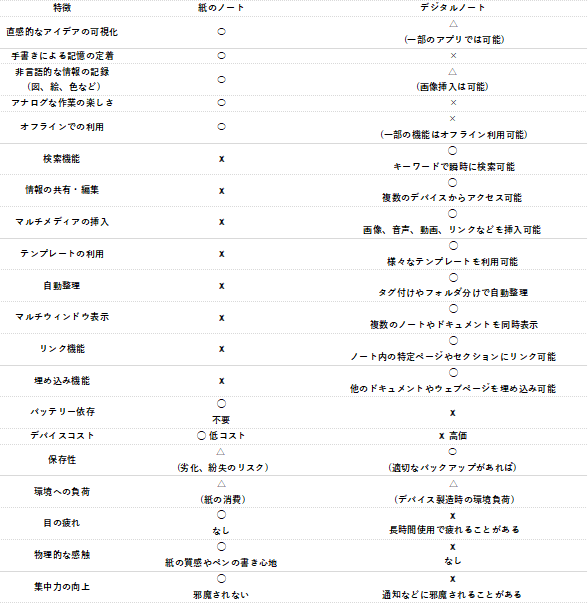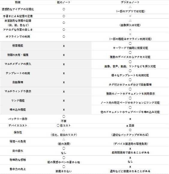 フォーカスするため、グレーダウンした部分(紙のノート☓、デジタルノート◯)だけを別表にします。(表6)