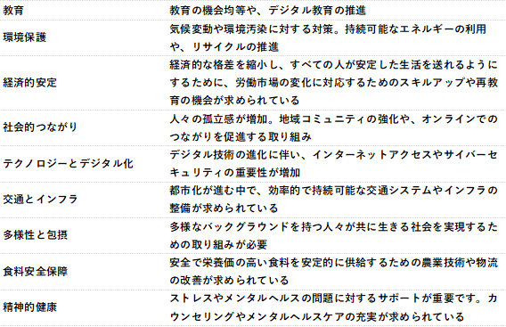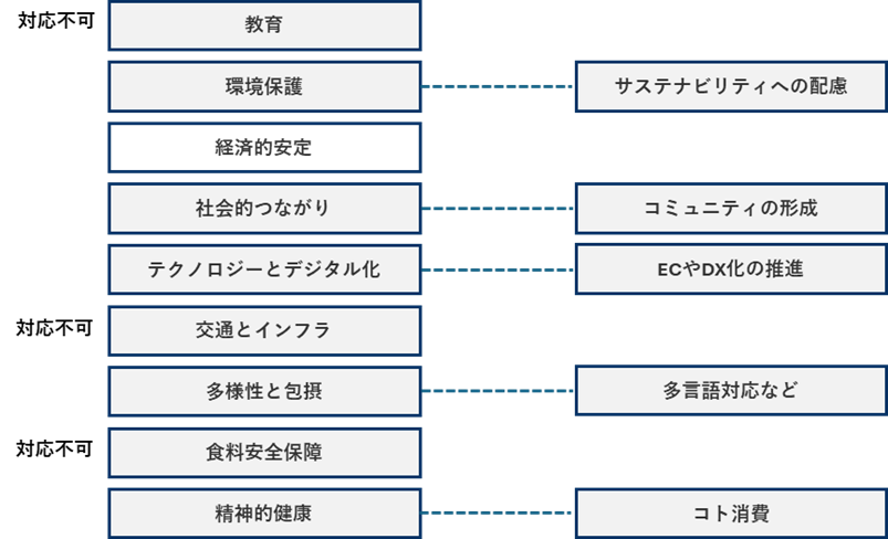 「教育」「交通とインフラ」「食料安全保障」といった項目は、明らかに国、自治体レベルの対象範囲である上、そもそも役割との関連性が見いだせません。