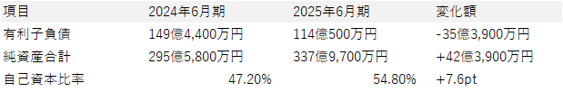 純資産が増加し、自己資本比率が54.8%まで大幅に改善しました。この数字は、企業の安定性を示す非常に重要な指標です。外部環境の変動に左右されにくい、強固な経営体質が構築されたことがわかります。