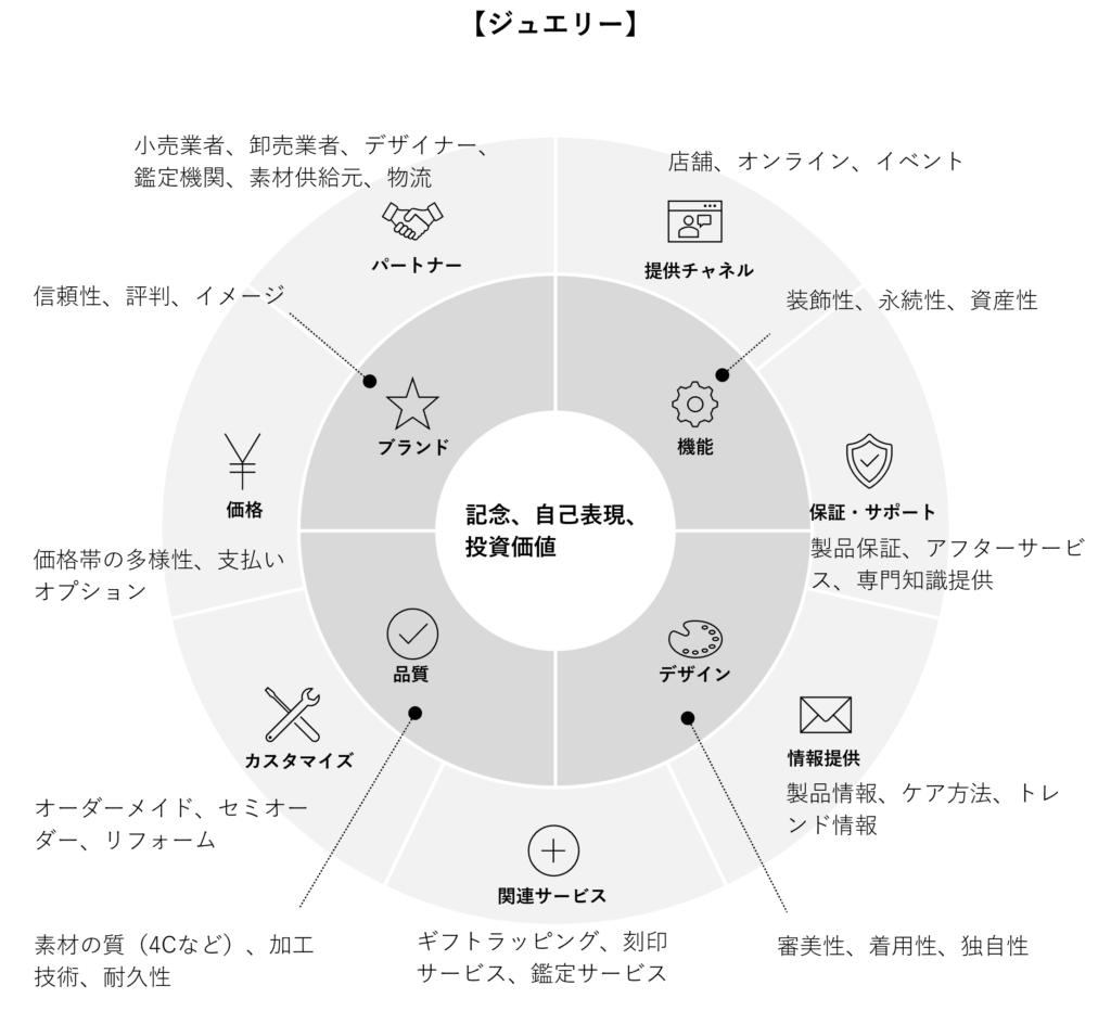 ジュエリーは、単なるモノではなく、顧客の「記念、自己表現、投資価値」という本質的な価値を、多様な要素を組み合わせることで創造しています。あなたのビジネスも、このモデルを参考に、顧客の真のニーズを満たすための包括的なプロダクトを設計してみてはいかがでしょうか。