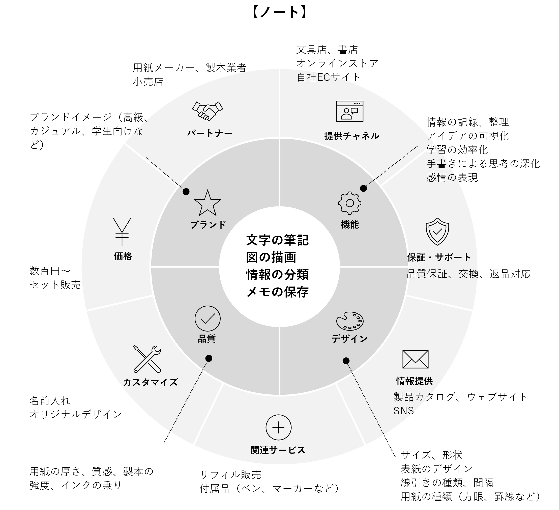 「思考の整理・アイデア創造」。ノートが顧客に提供するのは、単なる紙の束ではありません。この図は、ノートというプロダクトが、いかに多くの要素を組み合わせて顧客の知的活動をサポートしているかを示しています。これからビジネスを始めようとしている皆さんは、このモデルから、プロダクトが持つ「本質的な価値」をどう創造するかを学んでみましょう。