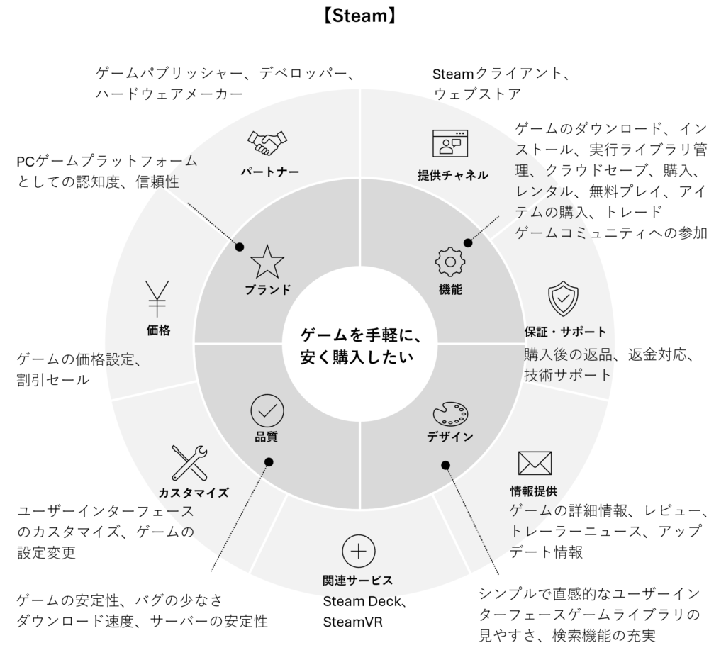 「ゲームを手軽に、安く買いたい」。Steamが顧客に提供するのは、単なるゲームの販売プラットフォームではありません。この図は、Steamというプロダクトが、いかに多くの要素を組み合わせて顧客のゲーム体験を豊かにしているかを示しています。これからビジネスを始めようとしている皆さんは、このモデルから、プロダクトが持つ「本質的な価値」をどう創造するかを学んでみましょう。