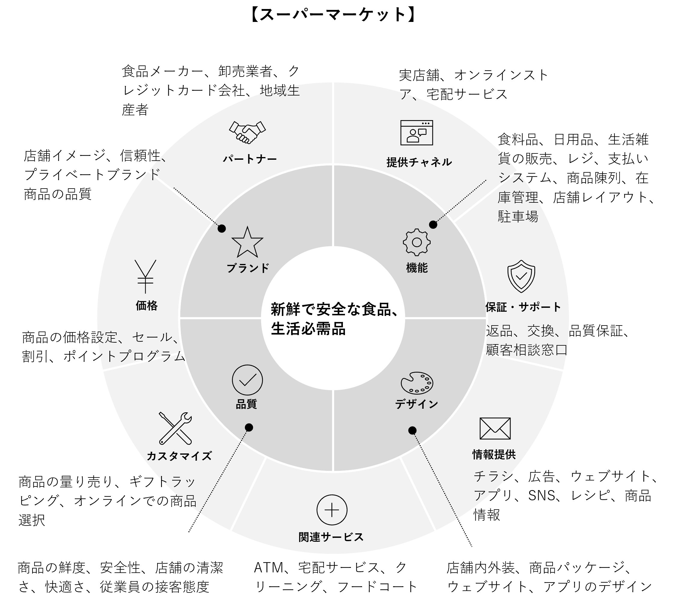 「お昼ごはん、何にしようかな」「今日の夕飯の材料、何が安いかな」 スーパーマーケットは、私たちの日常に最も身近なビジネスの一つです。この図は、単に商品を販売する場所ではなく、「新鮮で安全な食品、生活必需品」という顧客の根源的なニーズに応える、緻密なプロダクト設計がなされていることを示しています。