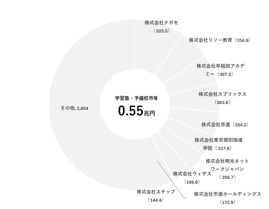 学習塾・予備校の市場規模はそれほど大きくなく、5,500億円ほど。しかし、参入障壁が低いことから、プレイヤーがひしめき合っています。上位10社の売上合計でも市場の50%を超えていません。