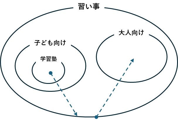 学習塾を抽象化すると、上記の図のようになります。学習塾は習い事の1つに属しており、さらに、子ども向けや大人向けといったカテゴリーがあります。
