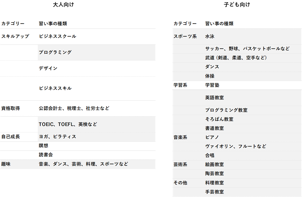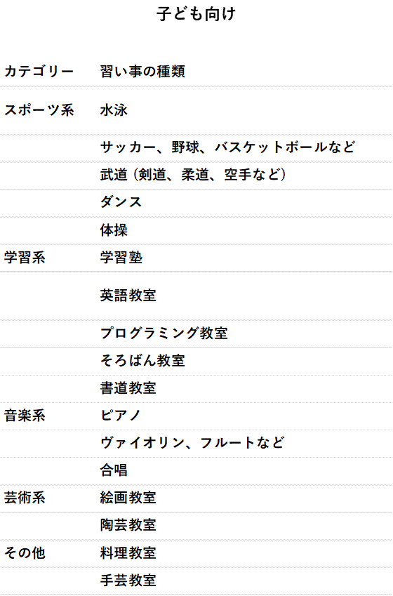 そこで、子ども向けではなく、大人向け、社会人向けに提供されている「習い事」に目を向けてみます。その前に、子ども向けの習い事にはどのようなものがあるのかを確認しておきましょう。