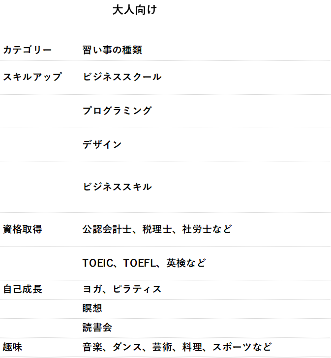 子ども向けに提供されている習い事は大きく5つ。「スポーツ系」「学習系」「音楽系」「芸術系」そして、料理教室や手芸教室といった「その他」です。昔からあるそろばん塾のほか、ダンスといった比較的最近のものが並んでいます。続けて、大人向けの習い事を確認してみましょう。